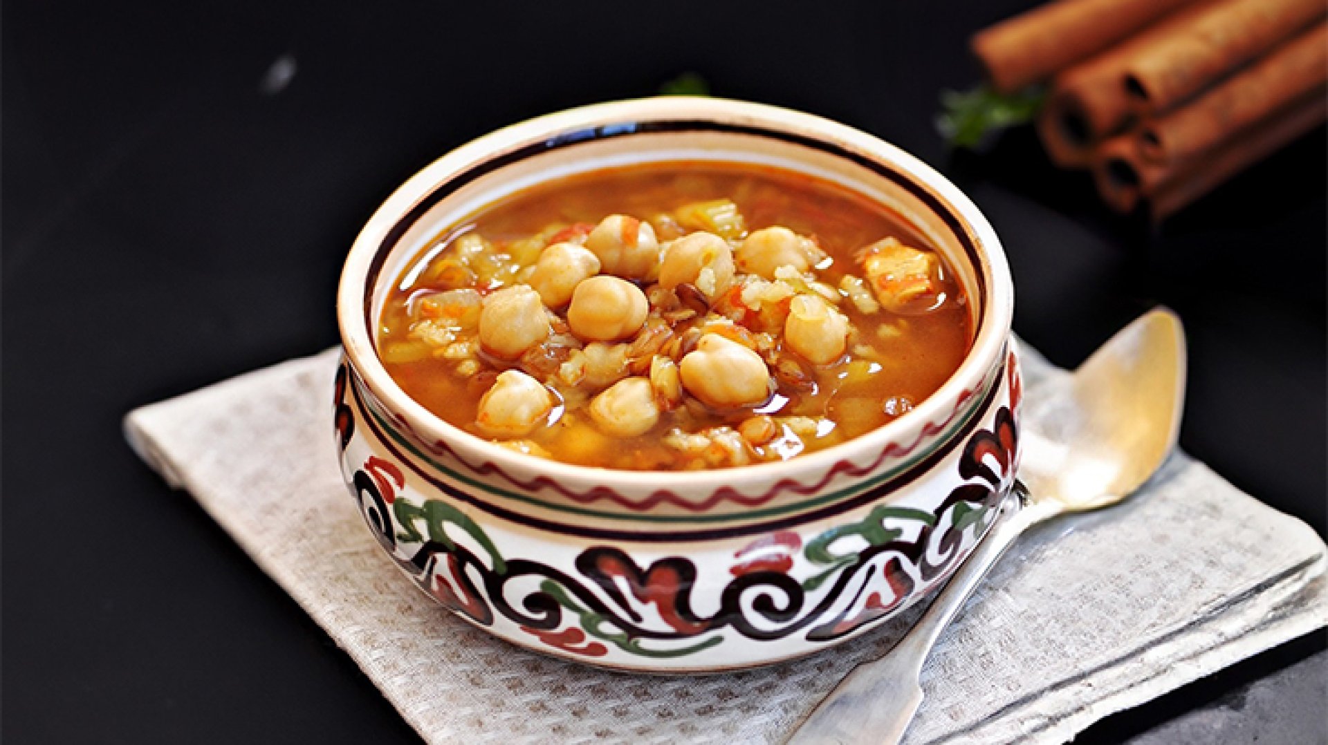 Harira Soup contains lentils, chickpeas, tomatoes, and a variety of spices including coriander, ginger, and cinnamon. It is traditionally served with dates, soft-boiled eggs, and sweet treats like Chebakia (sesame cookies soaked in honey).