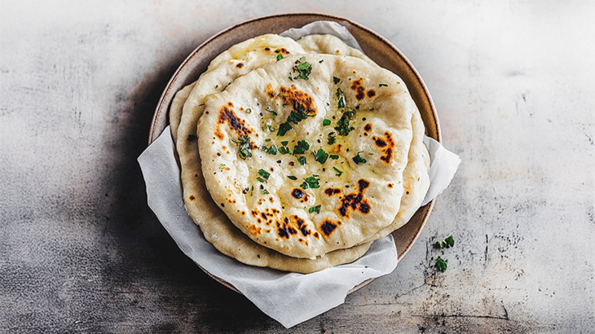 Naan is a type of bread originating from India, known for its soft, fluffy texture with small air pockets and a slightly salty taste. Traditionally baked in a tandoor, a clay oven, naan has a distinctive smoky aroma. Unlike roti, naan is made with yeast or yogurt, which gives it a unique rise and softness.