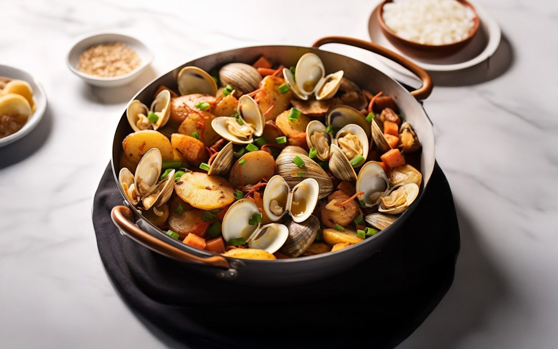 The preparation of this dish begins by marinating diced pork with minced garlic, paprika, and white wine. This step allows the pork to absorb the flavors and become tender. The marinated pork is then seared in a pan until golden brown and fragrant. Simultaneously, potatoes are diced and deep-fried until perfectly crispy. The final stage involves combining all ingredients, including the cleaned clams, and sautéing them together in a pot or pan once more, ensuring all flavors meld perfectly. Before serving, the dish is typically garnished with fresh cilantro or parsley, adding a vibrant color, freshness, and an inviting aroma.