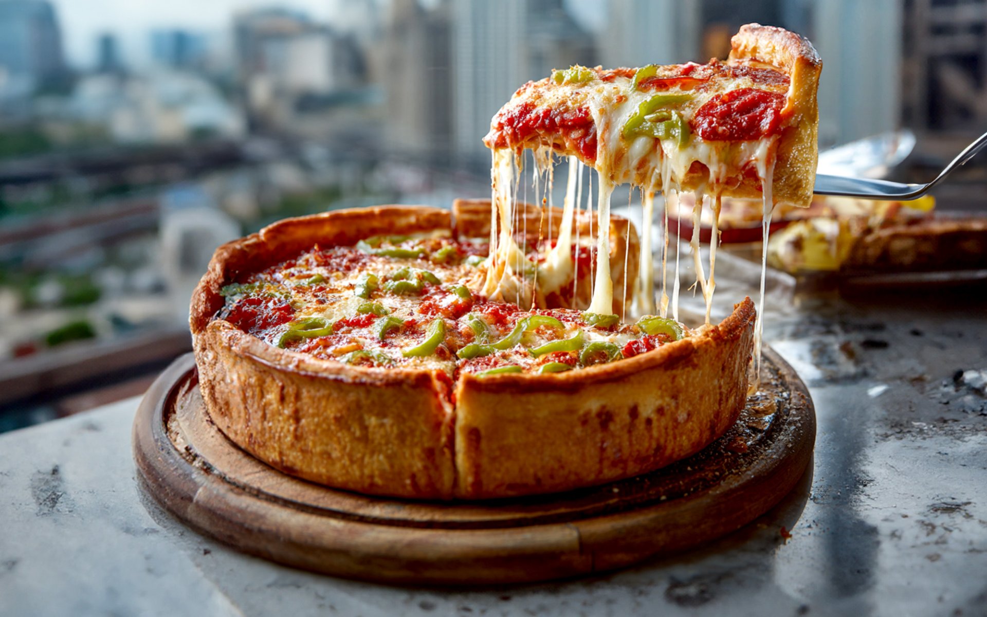 Deep Dish Pizza was designed to reflect Chicagos culinary spirit bold, hearty, and indulgent.The preparation requires specific techniques to achieve its perfect balance of texture and flavor. The thick dough is baked in a deep pan to support the dense filling, with layers of mozzarella cheese placed at the bottom, followed by toppings, and finally tomato sauce spread over the top to keep everything moist and flavorful during baking.