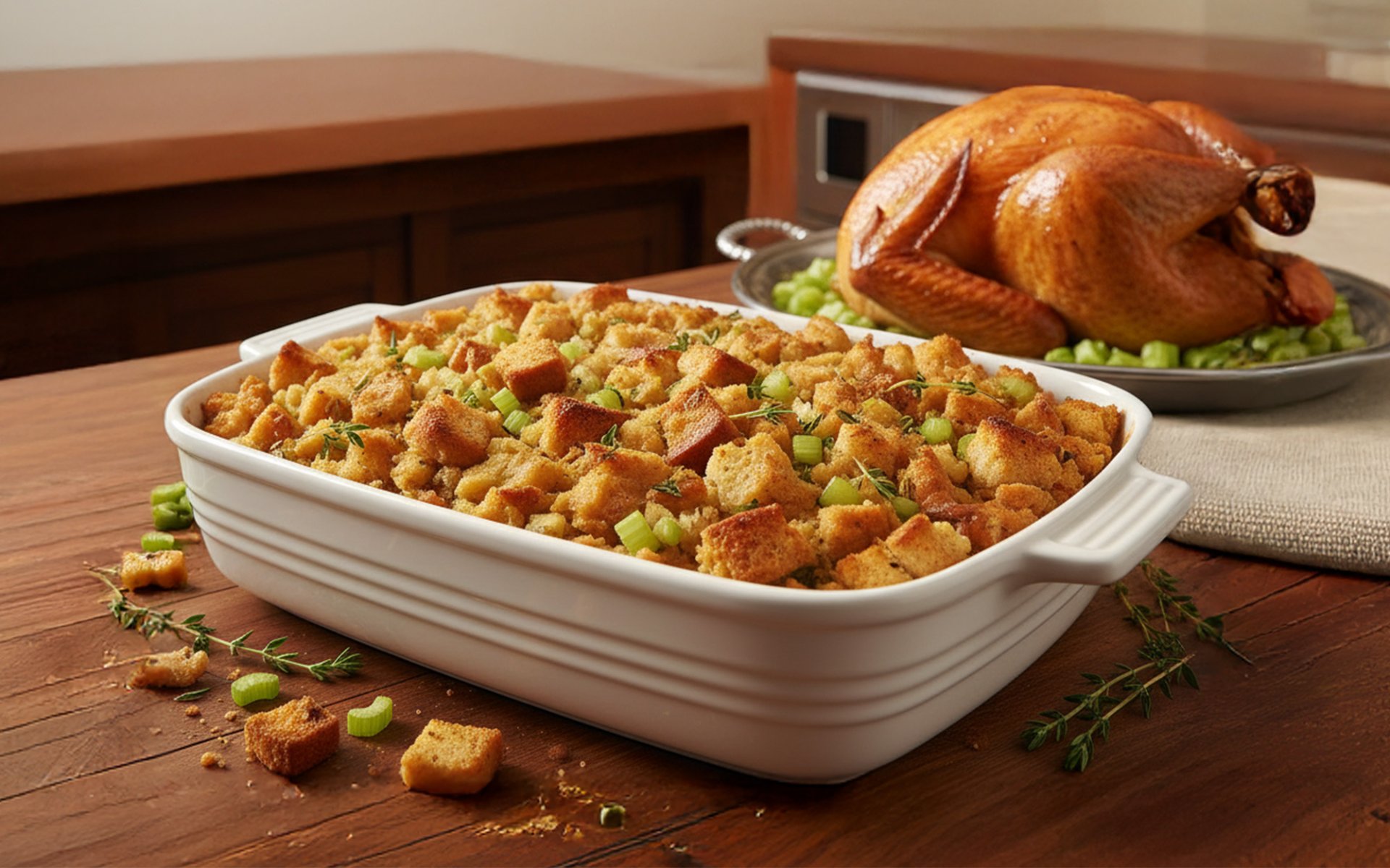 Stuffing is a popular mixture commonly used to fill the inside of a turkey, enhancing both the flavor and texture of the meat. The main ingredients typically include cubed bread, onions, celery, and butter, seasoned with aromatic herbs such as sage and thyme, then moistened with stock to achieve a tender and flavorful texture.